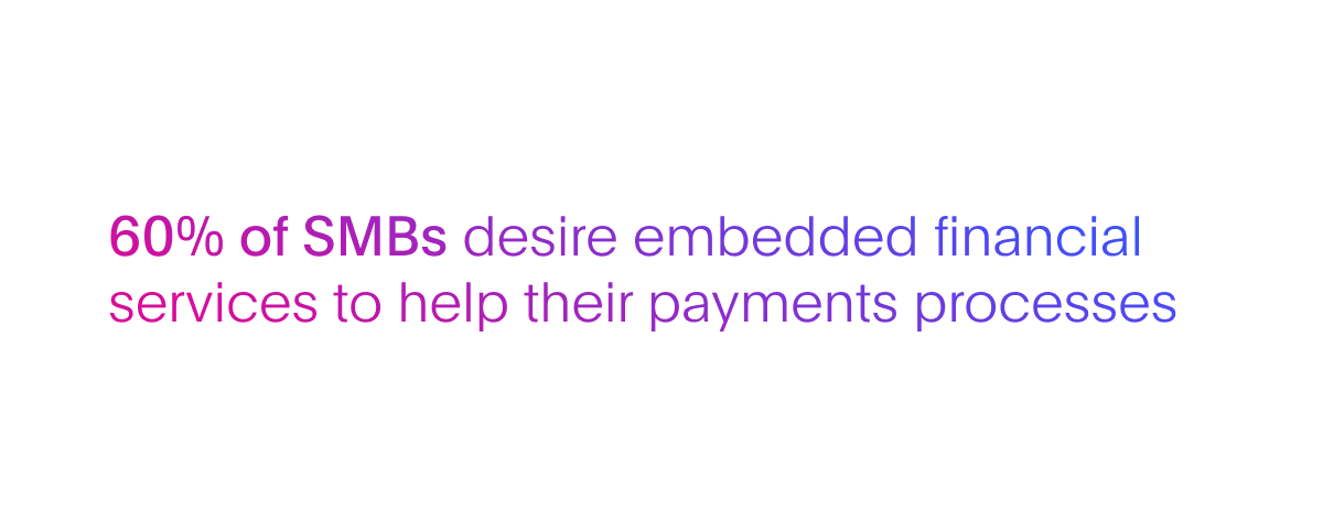 A recent study found that 60% of SMBs said they desire embedded financial services to help them smooth their payments processes, while 50% believed embedded solutions would offer enhanced payment data that could drive actionable insights into their operations.